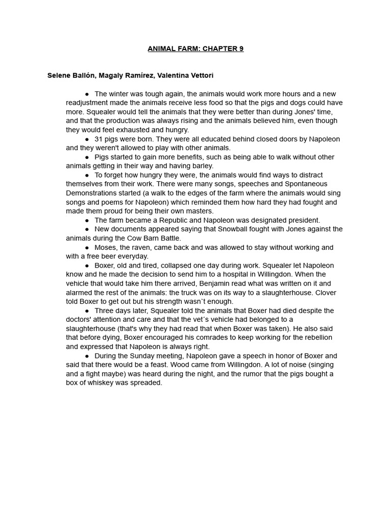Animal Farm Chapter 9 Questions - Spontaneous demonstration, which celebrates the triumphs and hardships of animal farm. Why is benjamin upset when he sees. What happens with moses, the raven? What official change is made to the government of animal farm? They can be used alongside the summary revision video:. What did napoleon discourage the piglets to do? They can be used alongside the.