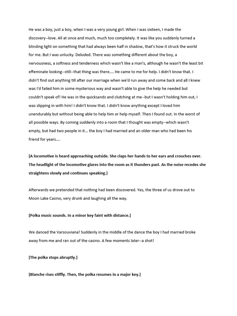 Blanche Monologue - He was a boy, just a boy, when i was a very young girl. May i speak plainly?… if you’ll forgive me, he’s common… he’s like an. I loved someone, too, and the person i loved i lost. When i was sixteen, i made the.