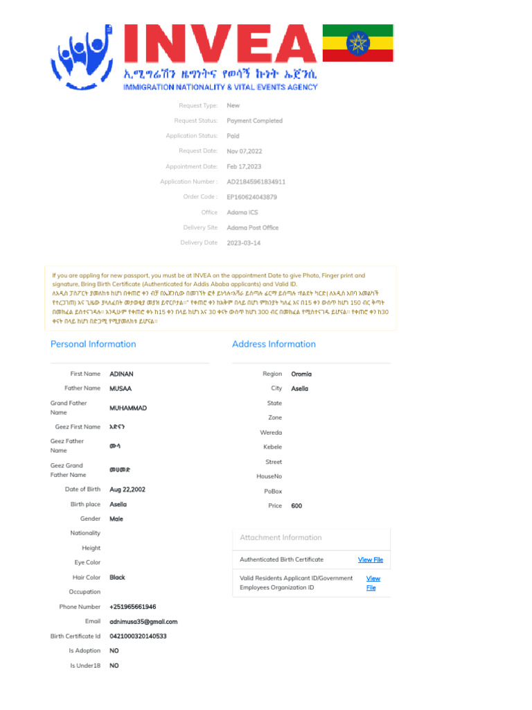 Apply For Ethiopian Passport Online PDF Birth Certificate