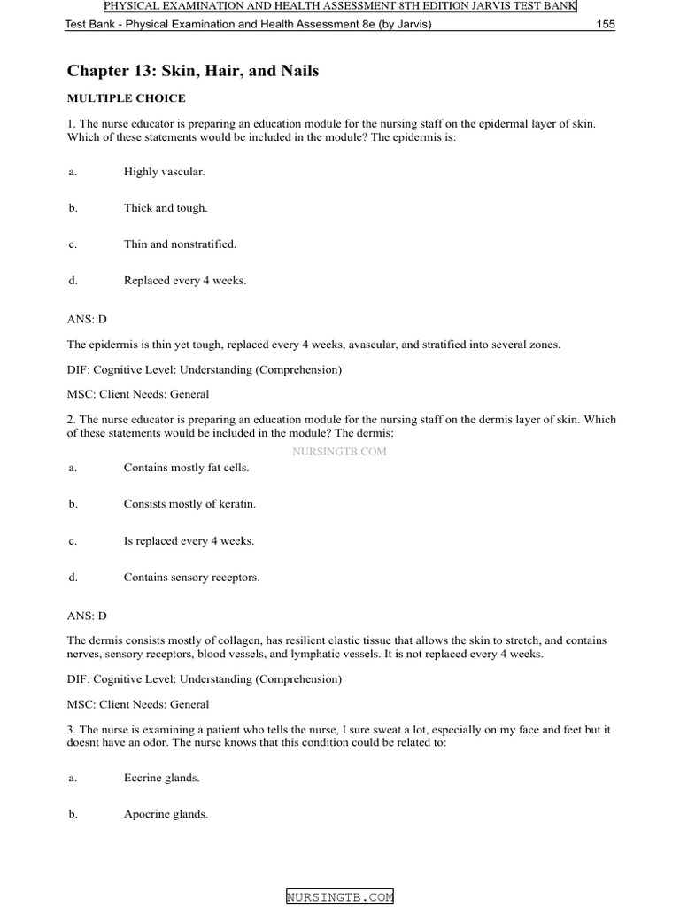 Jarvis Chapter 13 Skin Hair And Nails Test Bank - Chapter 13 of jarvis physical examination and health assessment 8th edition on skin, hair,. B., age 78, asks about small, round, flat, brown macule on the hands. During a routine visit, m. View tb ch13 skin hair nails.pdf from nur misc at cuny lehman college.