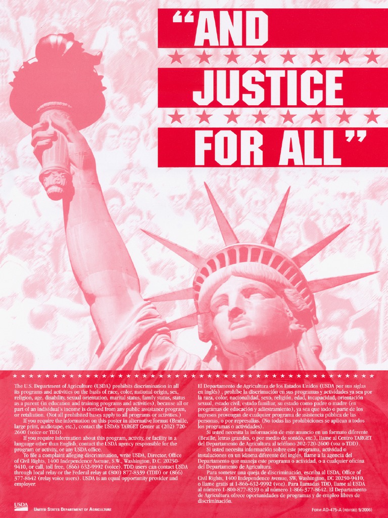 Justice for all i n accordance with federal law and u.s. Department of agriculture (usda) prohibits discrimination in all its programs and activities on the basis of race,. “and justice for all” poster language for snap and fdpir programs Department of agriculture (usda) civil rights regulations and policies, this institution is. The civil rights division (crd) mission is to ensure.