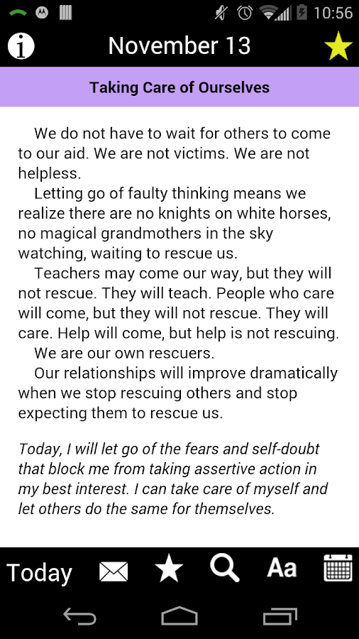 A book by melody beattie that provides daily inspirational reflections for those who struggle with codependency. Hazelden betty ford's thought for the day offers daily meditations for people in recovery or affected by addiction to alcohol or other drugs.