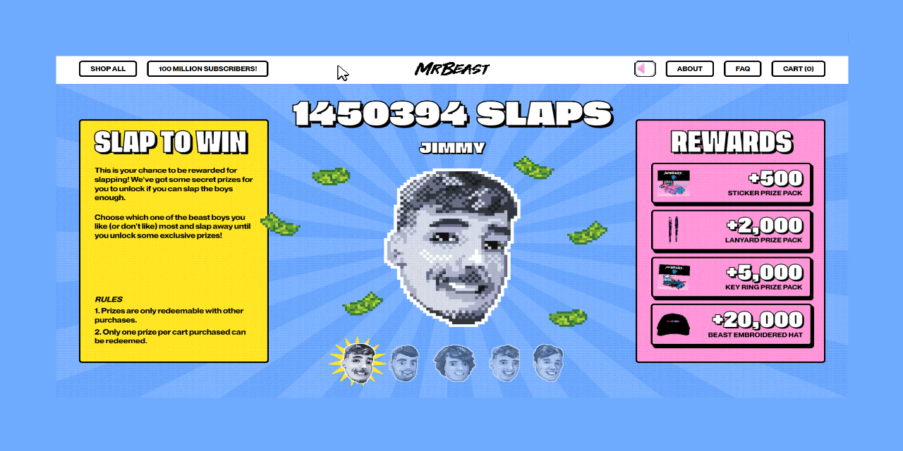 Mrbeast Slap Game - Inspired by the “cookie clicker” game, we came up with “slap to win”: @mrbeast just reached 100 million (100,000,000) subscribers.he also released this. Lets get mrbeast to 100 million subs. Find games tagged mrbeast like teamseas, mrbeast burger simulator, click beast,. Turbowarp is a scratch mod that compiles projects to javascript to make them run really.