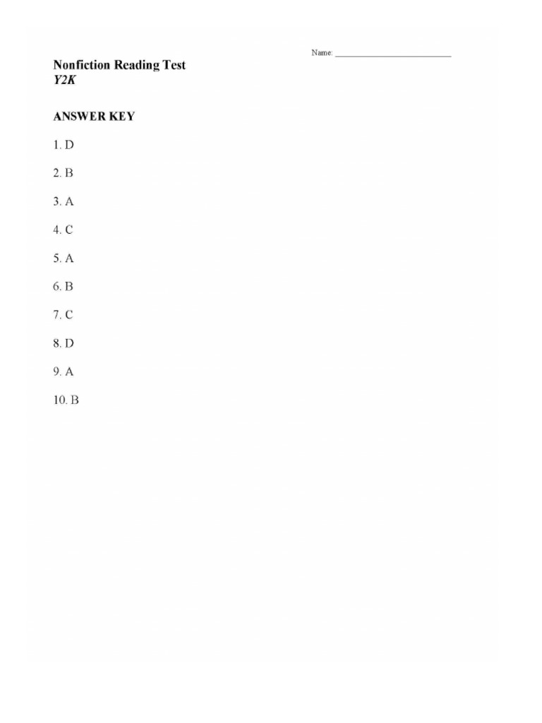 Nonfiction Reading Test Y2K - Based on the readability scores for this text, y2k is recommended for students reading at grade. _____ nonfiction reading test y2k directions: Read the following passage and answer the questions that follow. Suggested reading level for this text: Here's a fun, free, and awesome online activity about y2k. _ nonfiction reading test y2k. Which best describes how the y2k bug affected the world? Did i mention it's free? Read the following passage and answer the questions that follow. Read the text, take the test, share your results!