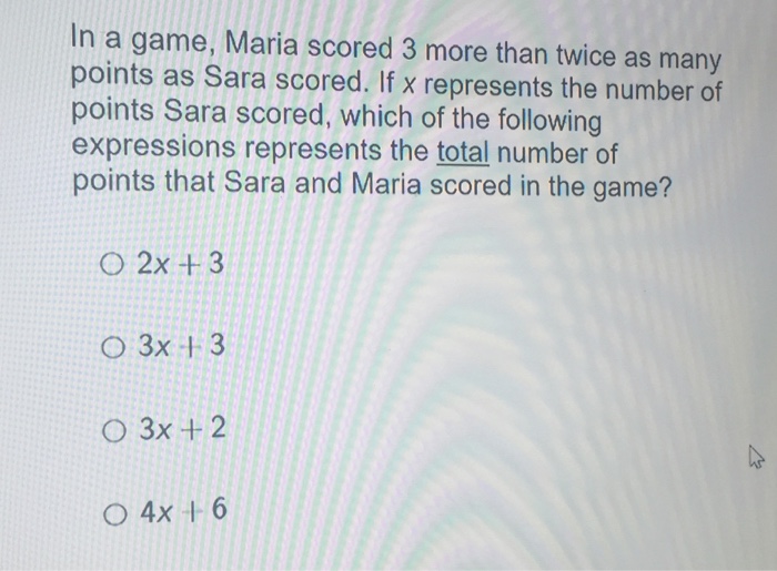 Solved In a game, Maria scored 3 more than twice as many