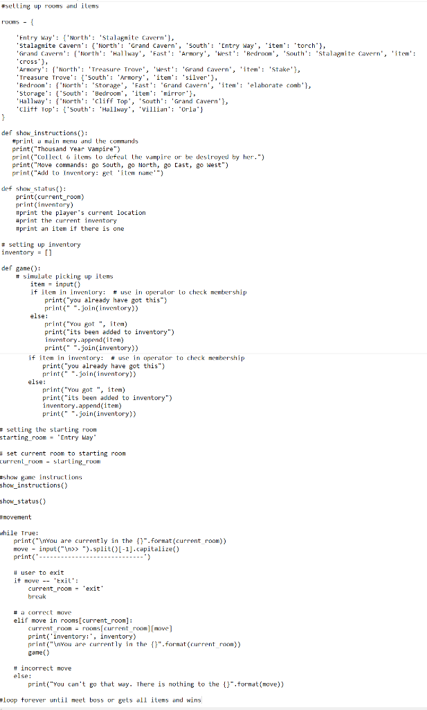 Items can be found in rooms and can be picked up or used. # print the main menu instructions. Here is my code so far: