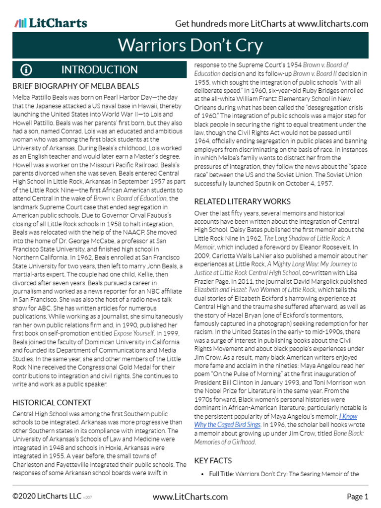 This study guide consists of approximately 28 pages of chapter summaries, quotes, character. Complete summary of melba pattillo beals' warriors don't cry. Get all the key plot points of melba beals's warriors don’t cry on one page. Need help with chapter 3 in melba beals's warriors don’t cry?